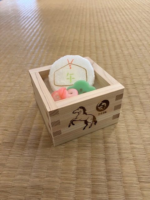 今月の器付き茶道体験プランは干支の午が焼印がされた枡に干菓子が有平糖、松の寒氷、絵馬の麩の焼と3つ和菓子が付いてくる特別茶道プランです。